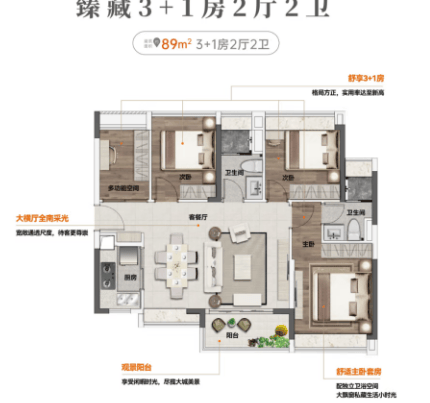 建面约89㎡/4房2厅2卫:南北对流设计,大横厅南向采光,通风良好,观景效果佳。