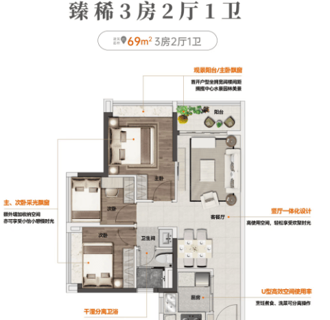 建面约69㎡/3房2厅1卫:紧凑实用的设计,适合小家庭或年轻夫妇。