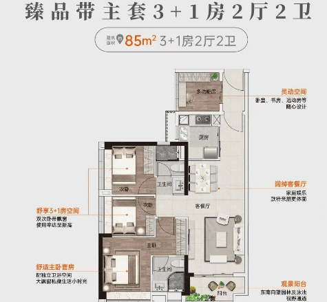 建面约85㎡/4房2厅2卫:东南向望园林及泳池,配备独立卫浴空间,非常适合追求舒适生活的家庭。