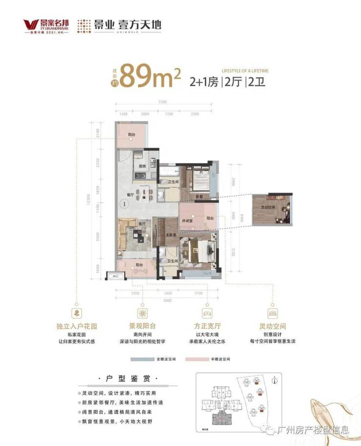 约 89 ㎡ 2+1 房+2 厅+2 卫+入户花园