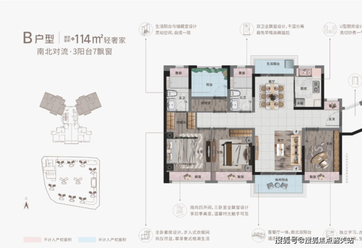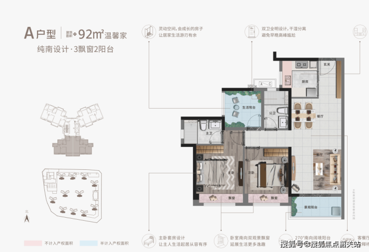 得房率85%:通过飘窗全赠送、设备平台半赠送实现空间最大化;