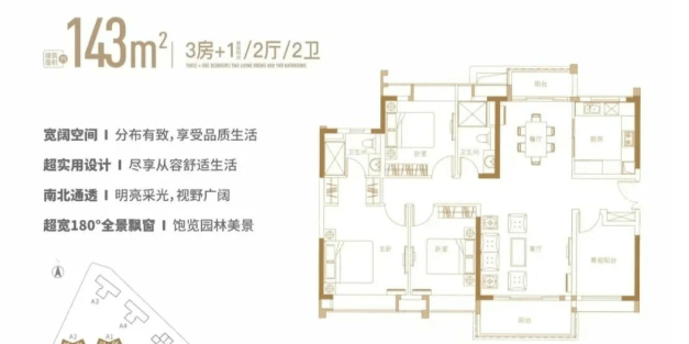 项目提供多种户型选择,包括99㎡、103㎡、108㎡、117㎡、143㎡、193㎡、238㎡和260㎡的三四房户型。主力户型为89㎡三房两厅两卫(适合刚需家庭)和143㎡四房两厅三卫(改善型住宅),部分户型设计了南北双阳台和270°转角飘窗,空间利用率高。