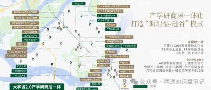 国际创新城板块又称大学城2.0版本,这个片区目规划有,大学智慧谷一期,智慧谷二期,智慧谷三期,还有产业孵化基地。化龙农业大观园,广州大学城科技创新产业园,广州国际商业展贸城等等。