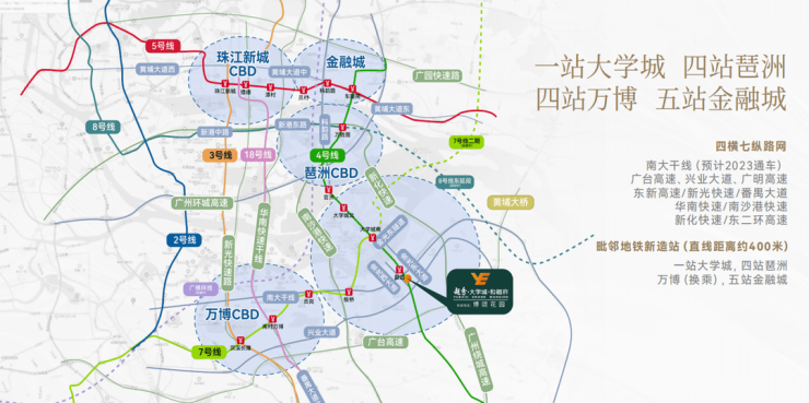 周边有13所高校,从这里出发至万博、琶洲、金融城都非常方便,几大黄金交通线路的开通,使得项目完美实现一步繁华,而且也自带11万方公园,实现了一半公园一半城的社区。