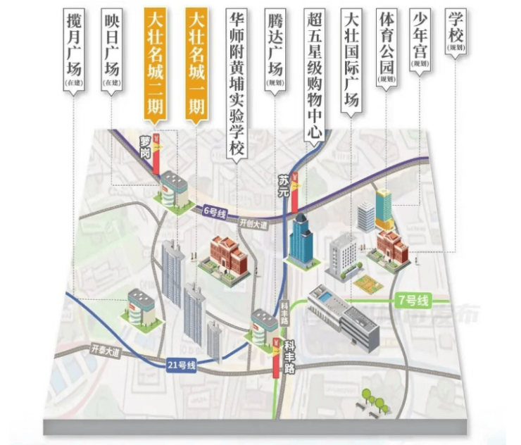 大壮名城・名门是科学城罕见的三地铁交汇大盘,6 号线、7 号线二期、21 号线全线开通,无需等待规划,出行即享便捷: