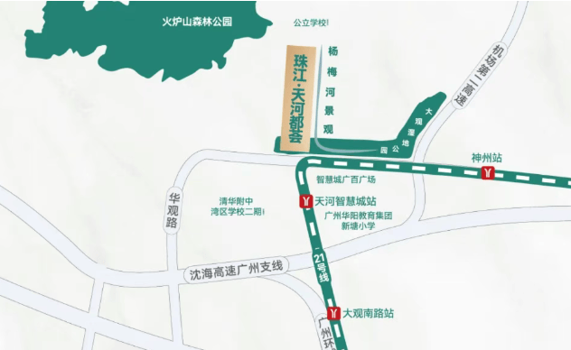项目距离天河智慧城地铁站约600米,可通过21号线快速到达金融城等地,交通便利。此外,项目周边还有多条公交线路,进一步提升了出行的便捷性。