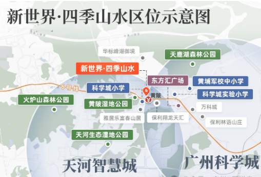 新世界·四季山水是由深圳新世界集团开发的高端住宅项目,位于广州市黄埔区天河智慧城和科学城交汇处。该区域是广州东进第三科创中轴的核心地带,紧邻三大CBD,交通便利、教育资源丰富、生活配套设施完善。