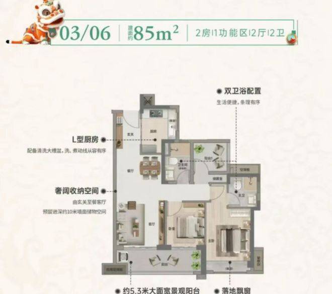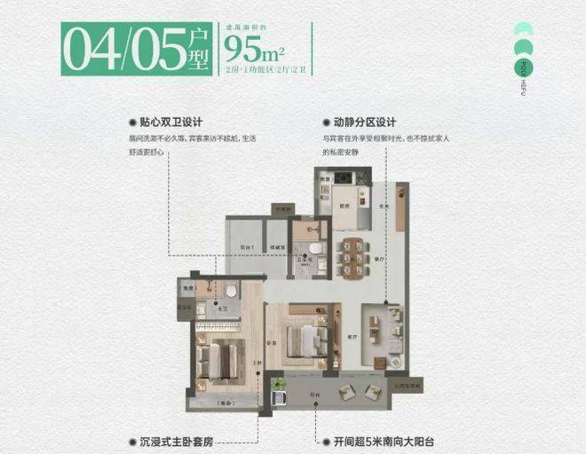 95㎡户型的亮点在于约 5 米宽幕大阳台,这一设计为整个户型增色不少。阳台连接客厅,使得客厅空间更加开阔明亮,充足的阳光能够洒满整个房间。站在阳台上,视野开阔,无论是小区园林景观还是周边城市景色都能尽收眼底。可将阳台打造成休闲花园,摆放绿植花卉,营造舒适的自然空间;也可放置桌椅,成为品茶、阅读的惬意角落。