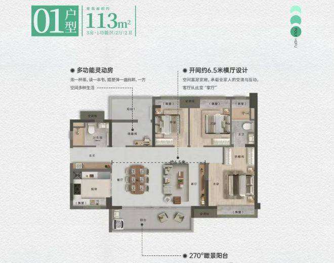 113㎡的 6.6 米大横厅户型,以其宽敞大气的横厅设计脱颖而出。6.6 米的大横厅连接观景阳台,形成一个超大面积的公共活动区域,空间开阔,采光通风极佳。无论是家庭聚会、朋友派对还是日常休闲娱乐,都能轻松应对,彰显主人的大气风范。横厅可根据家庭需求灵活布置,划分出客厅、餐厅、休闲区等不同功能空间,满足多样化生活需求。
