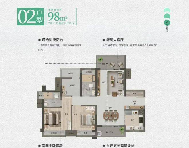 约 98㎡的对流双阳台户型,南北通透,空气流通顺畅,为室内带来清新空气,营造舒适的居住环境。双阳台设计增加了空间的实用性,南向阳台连接客厅,采光极佳,可用于晾晒衣物、休闲观景;北向阳台可与厨房相连,作为生活阳台,放置洗衣机、杂物等,让生活更加有序。
