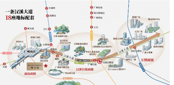 万科・檐屿城位于番禺,与广州南站紧密相连。距离 2 号线、7 号线地铁广州南站约 1.5 公里,虽步行稍远,但小区有公交车和楼巴接驳地铁站。2025 年,22 号线(后通段)开通后,5 站直达白鹅潭 CBD;广佛环线东环开通,3 站可到琶洲;东晓南路 - 广州南站连接线南段建成通车,与海珠城区 15 分钟互通,30 分钟连通珠江新城 CBD。以广州南站为中枢,构建起 “15 轨立体枢纽”,实现 4 站万博、4 站海珠芯、6 站珠城,湾区 1 小时通勤。