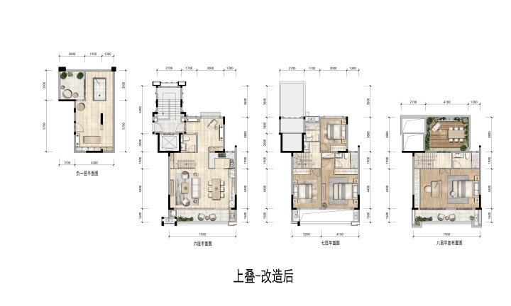 上叠:建筑面积131㎡,实际可用面积约300㎡,实用率高达200%,共4层,地上六、七、八层和地下一层。两个归家路线分别为从一层入户大厅进入或从车库坐电梯上来六层。六层为餐客厅厨房,七层设有3间卧室,八层则是南北通透的大主卧,配备露台和阳台。
