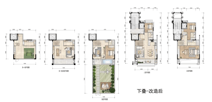 下叠:建筑面积131㎡,实际可用面积约400㎡,共5层,包括地面一二三层和地下两层。设计独特,拥有两个归家路线,一层设有一个近70㎡的私家花园和会客厅及一间南向卧房,二层包含餐客厅厨房及一间卧室,三层设有3间卧室,地下空间达近90㎡。