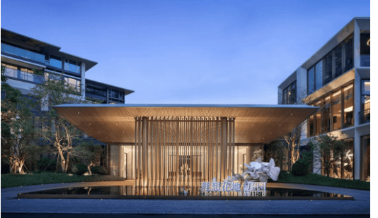 社区入口处,专门打造约8米宽环岛无雨落客区,搭配近12米长悬挑屋檐,再以取法自然、私密的竹影影壁墙点缀,每一步都如同五星级酒店下榻之旅,彰显高端格调。踏入酒店式内外接待大堂,更是有种误入六星级瑰丽酒店的既视感,辨识度极高,进一步提升居住的尊贵感。