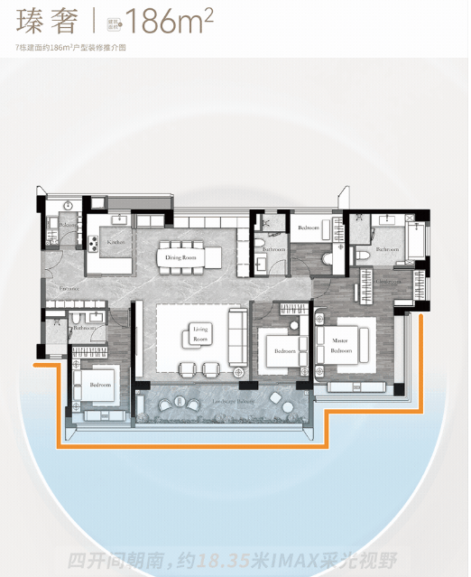 建面约186m²户型:4房+2厅3卫+灵动空间,正南向01、02户型坐拥一线花地湾河涌景观视野,全明四开间朝南,约18.3米极致奢幕视野;LDKB洄游路线,超80m²多功能巨幕宽厅,搭配多功能岛台与精致展示柜,收纳与实用兼具;超40m²端厅套房主卧,享受酒店总统套房级体验,适配高端改善、多代同堂家庭。