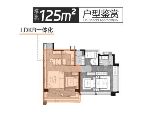 建面约125m²户型:3房+2厅2卫+灵动空间,全明4开间朝南,约12.8米大面宽舒居,IMAX大方厅,LDK一体化设计,搭配全屋科学收纳系统,实用率高,空间舒展,适配三口之家或四口之家。