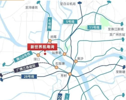 新世界凯粤湾所在区域被定位为白鹅潭门户综合区,未来将建设成为连接佛山、深圳、东莞等湾区城市的交通枢纽中心。随着广州4条地铁线路(1号线、11号线、28号线、22号线)交汇于白鹅潭站,该区域将成为重要的交通节点和商业活动中心。此外,项目周边还规划有万象城、太古汇等高端商业体,进一步提升了区域的价值潜力。