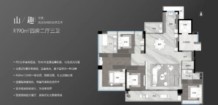 190平方米五房两厅四卫:超高使用率,采用豪宅主流LDKG一体化设计,无限放大家庭生活的精彩。