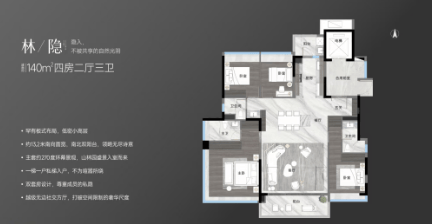 140平方米四房两厅三卫:低密度板楼设计,2梯2户配置,享中轴园林景观,三面被园景包围,极具赏景性。