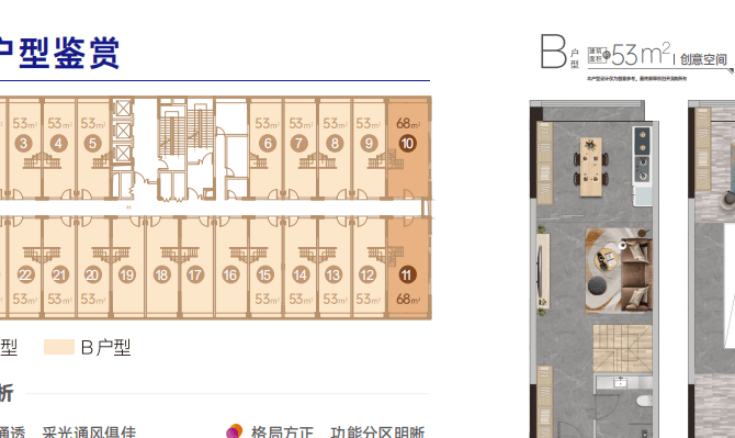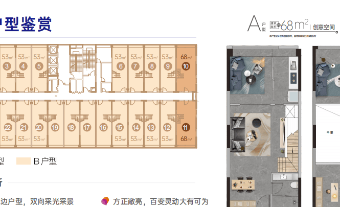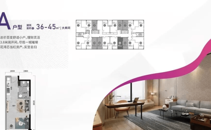 公寓类型:平层(36-68㎡)、复式(53-68㎡)
