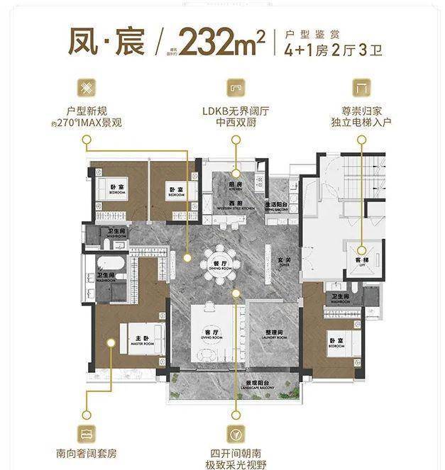 此户型在空间尺度上进一步升级,展现出更加阔绰的居住空间。客厅空间更为宽敞,挑高设计增强了空间的通透感与大气度,搭配大尺寸窗户或落地窗,引入更多自然光线与窗外景观。餐厅可容纳更大尺寸的餐桌,满足大家庭聚餐的需求。主卧套房不仅面积更大,还可能配备舒适的休息区,让主人在繁忙的生活中拥有一片宁静的私人空间。次卧同样宽敞舒适,可满足家庭成员不同的居住需求。户型的动静分区更加合理,休息区与活动区互不干扰,让居住者在享受家庭欢乐时光的同时,也能保证良好的休息环境。此外,约 270° 的景观视野,让居住者仿佛置身于美景之中,享受高品质的生活。