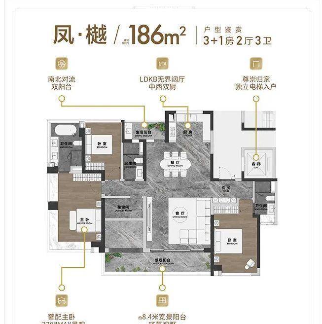 该户型方正大气,空间布局合理。约 18m 南向采光面,使得室内阳光充足,温暖明亮。客厅与餐厅相连,一体化设计让公共活动空间宽敞开阔,无论是家庭聚会还是宴请宾客,都能轻松容纳。约 270°IMAX 无界景观,让窗外美景尽收眼底,无论是德胜河的波澜壮阔,还是园林的葱郁景致,都能一览无余。卧室布局精心,主卧套房设计,配备独立卫生间与衣帽间,保障主人生活的私密性与舒适度。其余次卧空间也较为宽敞,可根据家庭需求打造为儿童房、书房等。约 99% 的户型实用率,几乎没有浪费的空间,每一寸面积都得到充分利用,为居住者提供了舒适且高效的居住体验。