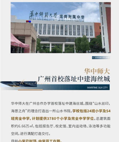 中建海丝城内规划有7所幼儿园、2所小学、1所九年一贯制学校和1所完全中学(初中+高中),其中已确定引入华中师范大学附属黄埔实验学校。该校以其卓越的教学质量和高升学率闻名遐迩,将为孩子们提供优质的教育环境和发展机会。同时,周边还有多所优质教育资源环伺,如文冲小学、怡园小学等,进一步丰富了教育选择。