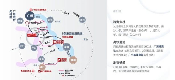 更令人瞩目的是其高铁优势:1站即达庆盛高铁枢纽,搭乘广深港高铁,30分钟直抵香港西九龙,2站可达深圳北站;未来广中珠澳高铁开通后,将进一步强化与中山、珠海、澳门的联动。加上南沙大桥、深中通道(在建)、狮子洋通道(规划)等跨海动脉,真正实现“30分钟互达港澳,1小时通勤湾区全境”的高效出行网络。