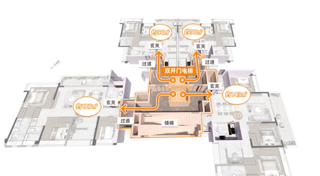 岭南府推出了多种户型供购房者选择,其中包含了建面约98㎡至128㎡的几种不同户型设计。以建面约98㎡的2+1房户型为例,该户型采用了豪华主卧套设计,配备了超大的270度转角飘窗,三开间南向采光,约9.8米的大尺度南向采光面,以及超大方厅,动静分明,非常适合追求高品质生活的家庭。