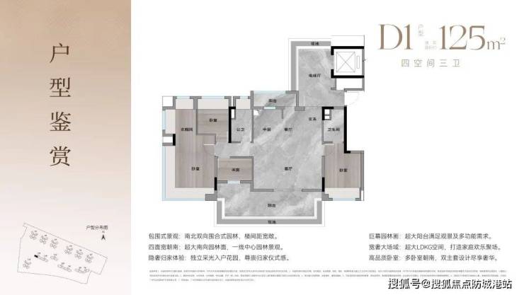户型设计:74㎡三房两卫、94㎡四房双主套、125㎡板式洋房专梯入户。
