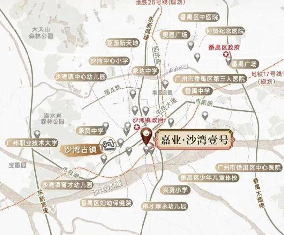 项目所在的沙湾板块,是番禺发展成熟、生活气息浓郁的居住区。教育方面,沙湾中心幼儿园、沙湾中心小学、象贤中学(广东省国家级示范性高中)等全龄段优质公校环伺,教育资源丰富。医疗方面,番禺区妇幼保健院、番禺区中心医院等多家三甲医院近在咫尺,健康保障坚实。商业休闲方面,四大综合商圈、莲花山旅游区、宝墨园等提供了充足的消费与休闲选择。这是一个“所见即所得”、无需等待配套落地的成熟生活圈,为嘉熙府的静谧内里提供了繁华而便捷的支撑。