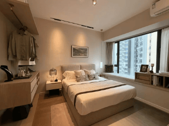 双阳台设计更是点睛之笔,生活阳台承担收纳晾晒功能,让日常杂物有序摆放;景观阳台则直面园心美景,闲暇时在这里种花种草、品茶观景,或是俯瞰 8.5 万㎡全生态园林的绿意盎然,轻松切换生活与休闲模式。私属主卧套房尽显尊贵感,一侧规划衣帽收纳空间,满足日常衣物存放需求;一侧衔接观景视野,南向园景尽收眼底。独立卫浴设计保障了居住私密性,让主人尽享舒适便捷的居家体验。