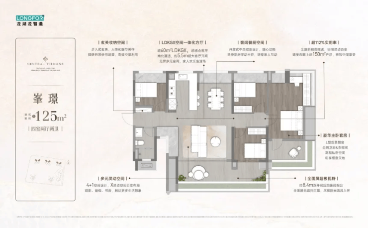3. 125㎡四房两厅两卫:横厅设计,俯瞰中央园林