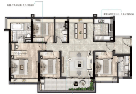 140平方米四室两厅三卫:方正宽奢布局,巨幕观景阳台,双套间大面宽。