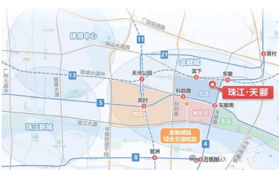 珠江天郦坐落于金融城北区,地理位置优越。轨道交通十分发达,项目位于 4 号线车陂站西边直线约 600 米处,周边还有现成的 5 号线、21 号线,在建的 13 号线二期也将为业主出行提供更多便利,后期 13 号线二期开通后,业主可通过 500 米私家连廊接入合生汇广场,连贯 13 号线棠下站。道路交通同样便捷,出门即是中山大道,附近有广园快速、华南快速、黄埔大道以及已开通的车陂南隧道,能快速抵达天河珠江新城、海珠琶洲等中心区域。周边便利设施丰富,一公里范围内有卜峰莲花、沃尔玛等大型商超,还有棠下大排档美食街,满足居民日常购物、餐饮需求,2 公里范围内则有暨南大学附属第一医院 (东圃院区)、南方医科大学第三附属医院等多家医院,为居民健康保驾护航。