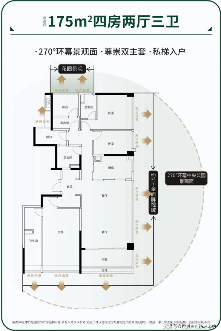 户型设计:主推110-175㎡大平层住宅,低密板式设计,专梯独户,270°视野无遮挡,部分楼栋设25㎡超大阳台及30米双向采景面。