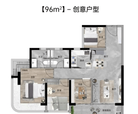 99–104㎡三至四房:经典“竖厅+双阳台”布局,部分可做四房,二胎家庭首选;