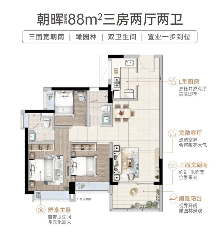 88平毛坯三房两卫户型是项目的刚需主力户型,总价199万任选,性价比突出。该户型布局紧凑,空间利用率高,没有浪费面积。客厅连接阳台,采光通风效果良好,让室内空间更加明亮通透。三个卧室尺寸适中,能够满足日常居住需求,其中主卧配备独立卫生间,保证了主人的隐私性和居住舒适度。两个卫生间的设计,也避免了高峰期家庭成员使用卫生间的冲突,提升了生活便利性。