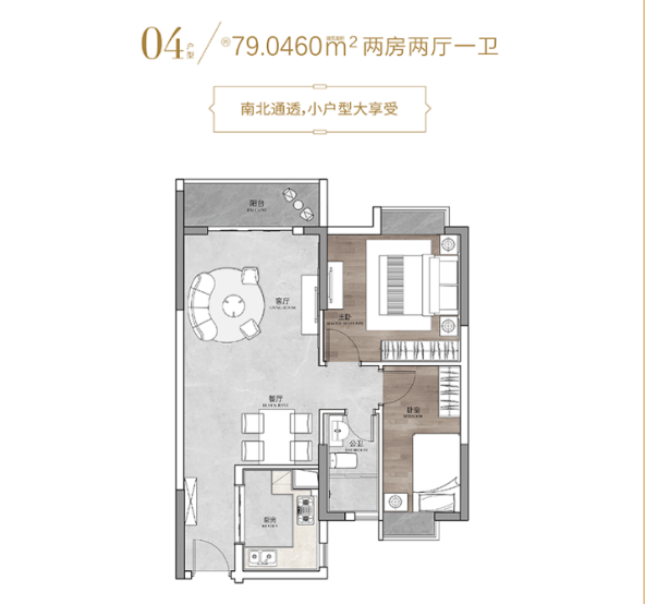 建面 79㎡的两房两厅一卫,是刚需购房者的首选户型,这个户型做到了南北通透,客厅和主卧的采光面充足,即使是阴天,室内也能保持明亮。双阳台设计是这个户型的一大亮点,南阳台连接客厅,适合休闲观景,摆上几盆绿植、一张小茶几,就是一个温馨的休闲角落;北阳台可以摆放洗衣机、储物柜,用于日常的杂物收纳,功能分区清晰,让客厅和卧室保持整洁。