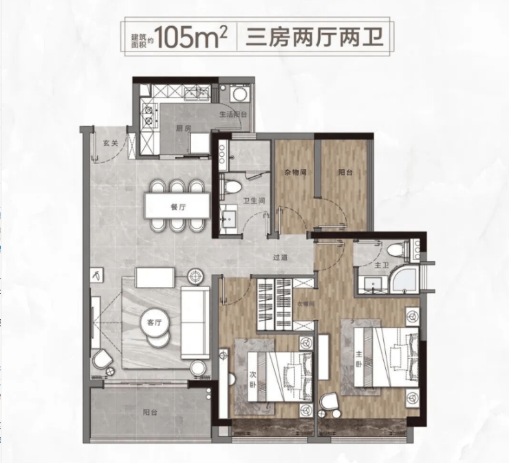 105㎡三房两厅两卫是电建地产洺悦玉府的刚需主力户型,总价约231万,分为A2、A2'两种户型,实地查看后能明显感受到空间布局的实用性。该户型采用南北对流设计,推开客厅与主卧的窗户,就能形成自然通风,即便在炎热的夏季,也能减少空调的使用,室内空气始终保持清新。厨卫均采用全明设计,没有暗角,厨房通风采光良好,烹饪时不易产生闷热感,卫生间则能有效避免潮湿异味,提升居住舒适度。客厅与主卧的采光面充足,午后阳光能洒满整个空间,搭配合理的空间分区,客厅作为活动区域宽敞明亮,卧室作为休息区域静谧舒适,紧凑的布局没有浪费任何一寸空间,十分适合三口之家居住,既能满足日常起居需求,也能预留出一定的活动空间。
