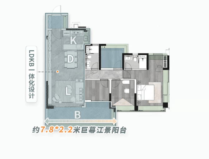 最吸引人的,莫过于该户型的8.3米长跑道式阳台,阳台连通次卧,空间宽敞,视野开阔。站在阳台上,江景和园林景观能无缝衔接,既能欣赏到珠江的波澜壮阔,又能看到社区内的生态园林,景观视野拉满。平时在阳台上晾晒、休闲,都能感受到大自然的美好,居住体验非常好。