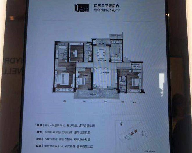 建面195㎡四房三卫双阳台户型图,观景阳台去到约8.4米,此外还有两个套房设计,真的是有钱就可以任性呀~