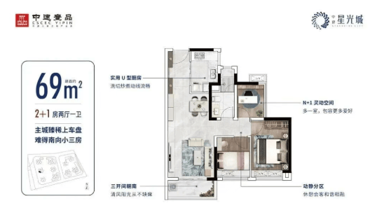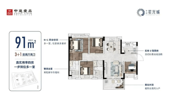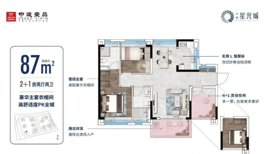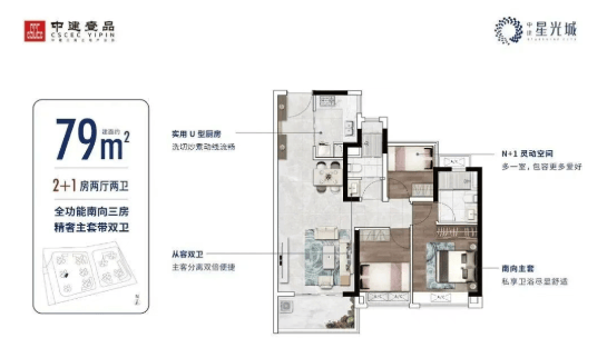 中建·星光城占地面积4.4万平方米,总建筑面积18.1万平方米,容积率3.0,绿化率35%,整体规划10栋住宅楼,分两期开发,层高21至25层不等,总户数1391户。其中3栋与4栋为安置房,其余为商品房。项目采用两梯六户设计,车位配比1:1.05,物业费为2.8元/㎡/月。目前项目已为现楼状态,正处于清尾货阶段,主力在售户型涵盖69㎡三房一卫、79㎡三房两卫、87㎡三房两卫及91㎡南北通透四房,实用率普遍超100%,满足刚需及刚改家庭对高性价比与高使用效率的核心诉求。