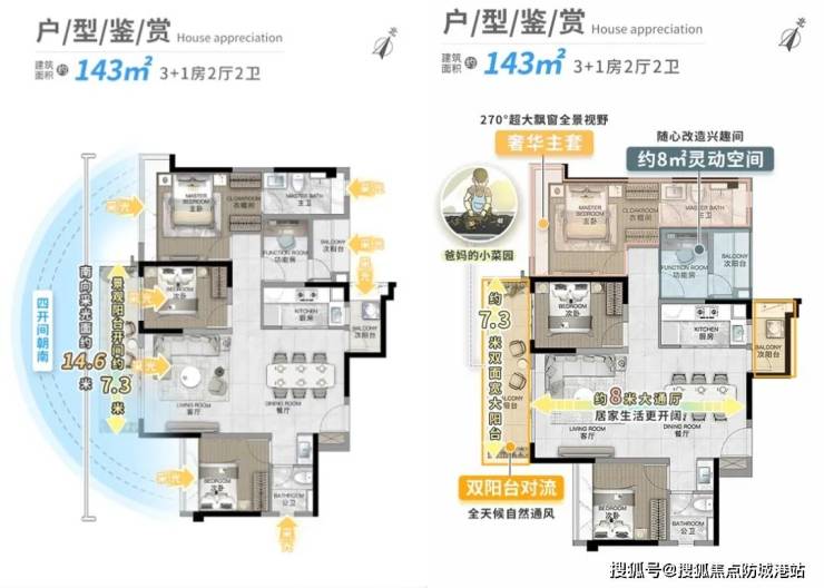 143㎡ 4房:豪华主卧套房,270°转角飘窗,多段式LDKG超长通厅,约14.6米超大南向采光面。