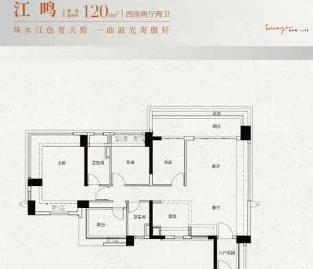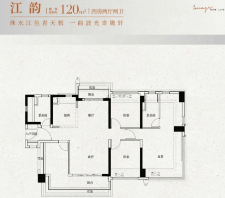 建面约120㎡四房两厅两卫:四开间朝南,居住与生活动静分离,南向大阳台或南北双阳台,主卧带270°飘窗。