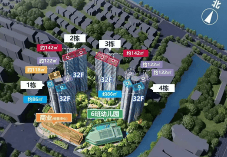 项目共有4栋住宅楼,其中2栋塔楼和2栋板楼。塔楼采用2梯4户的设计,涵盖建面约86-118-122㎡的多种户型;板楼则为2梯2户,清一色为建面约142㎡的大户型。