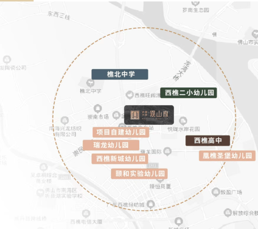 项目所在的官山新城作为《南海“十四五”规划》中的重点发展区域,拥有丰富的商业资源,包括恒邦广场、雅居乐大都会广场等。教育方面,项目自带一所12班幼儿园,并且周边有多所学校覆盖从幼儿园到高中的教育资源。医疗设施方面,附近有南海区第四人民医院和佛山市第五人民医院等三甲医院,确保了居民的健康需求。