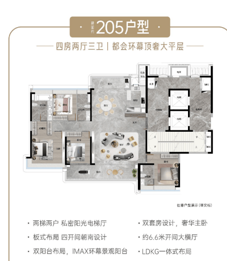 205㎡四房:环幕楼王户型,实测双阳台对流(景观阳台 + 家政阳台),景观阳台长度 9 米,客厅开间 5.2 米,双主卧套房设计(均带独立卫浴),南瞰北美暖林境园林,实测楼间距超 90 米,私密性与视野兼具,使用率达 90%;