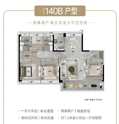 140㎡A 户型四房:高性价比优选,实测纯南一字板楼设计,南北对流,客厅开间 4.2 米,阳台进深 1.8 米(赠送一半面积),主卧套房含独立卫浴与步入式衣帽间(实测面积 22㎡),北望长隆野生动物世界,实测视野角度达 80%,使用率达 88%;