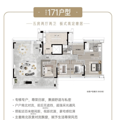 171㎡五房:低密 8F 小高层,专梯入户设计,实测南向面宽 15.2 米,四开间朝南,270° 景观阳台实测面积 12.5㎡,可俯瞰中央园林与长隆景区,主卧配备独立浴缸,全屋精装对标宝格丽酒店标准,使用率达 89%;
